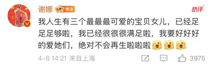 最后,她在评论区霸气留言:"我人生有三个最最最可爱的宝贝女儿,已经足足足够啦!绝对不会再生啦啦啦!"